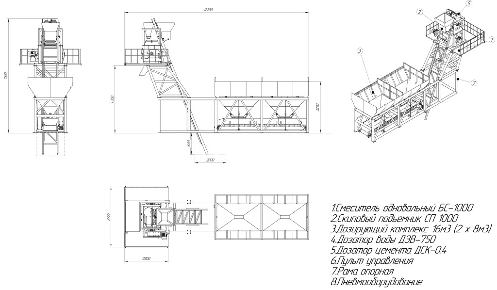 Производительность, м3/ час 30 Бетоносмеситель, модель БС-1000 Объем по загрузке, л 1000 Объем готового замеса по бетону, л 750 Объем готового замеса по раствору, л 850 Время перемешивания смеси, сек 30-90 Крупность заполнителя не более, мм 70 Подача инертных в бетоносмеситель скип Тип редуктора Ц2У Бункера, кол-во х объем м3 2х8 Пневматика Camozzi Компрессор Remeza Общая мощность, кВт 40 Режим работы автоматический Затвор секторный, привод пневмо Загрузка в скип, кг 1000 Напряжение питания, В 380 Время готовности изделия после включения, не более, сек 60 Время наполнения бетоносмесителя, не более, сек 30